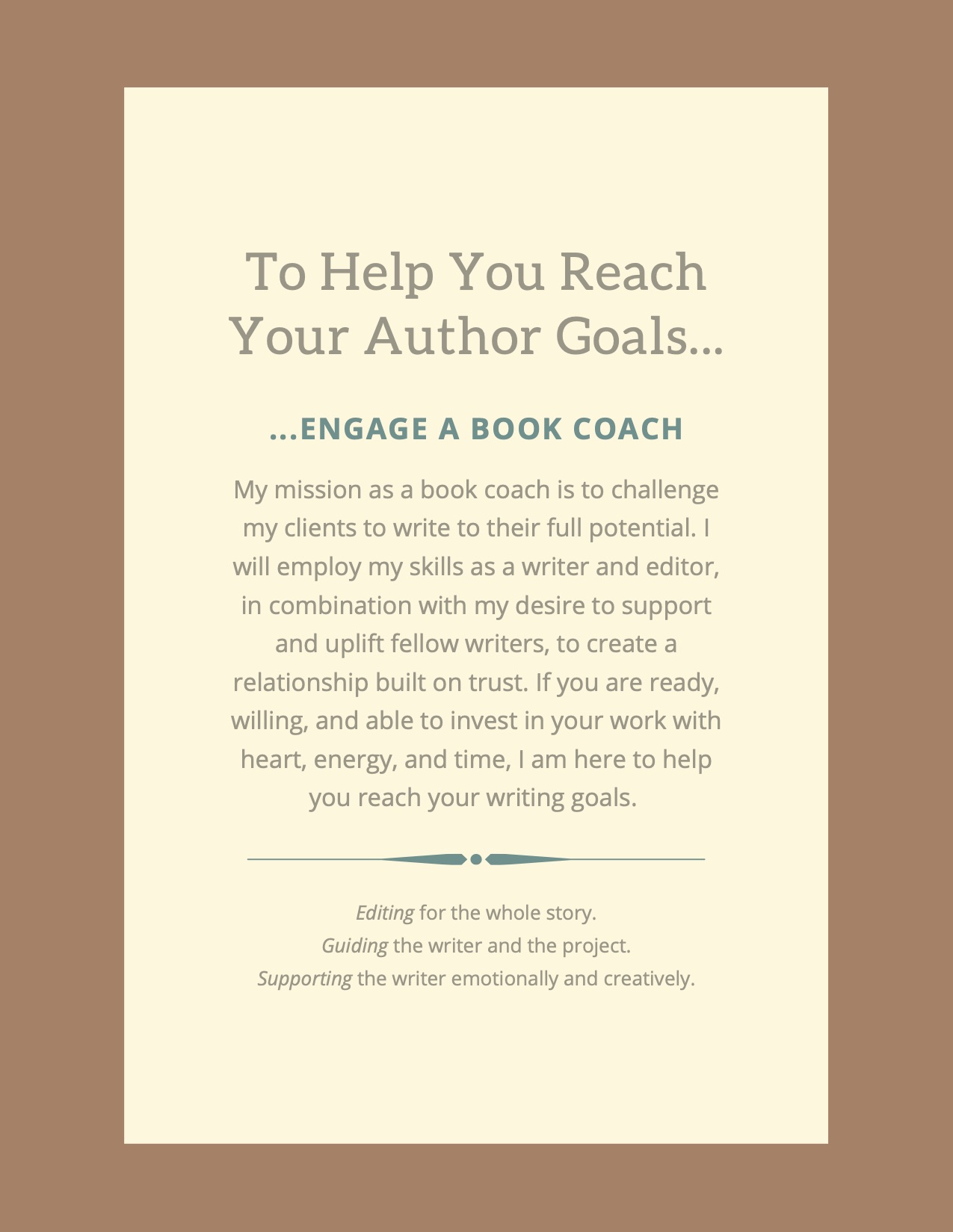 If you are a writer who is struggling with a manuscript, or a wishful writer wanting to begin to express your ideas on the page, book coaching may be for you. Book coaching is holistic, developmental, and my mission as a coach is to create a safe space for you as a writer to either learn the skills or conquer your current project.